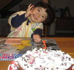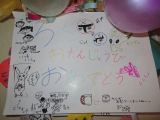などなど、結婚式でマイクを離さない酔っぱらいオヤヂのごとく、10分以上にわたり感謝の言葉を繰り返し繰り返し言い続け、爆笑のまま誕生日会は終わったのです。2014年3月4日 我が家では恒例の横断幕が緑之助の誕生日(本日)に合わせて依亜さんが製作。