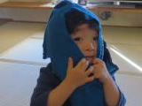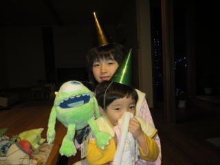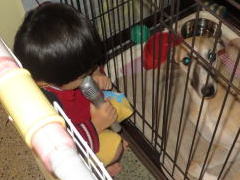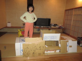 依亜ちゃんからは大きなプレゼント、特製ダンボールハウスです。さっそく緑之助が喜んで入りましたが、ヨロけてグシャ・・・ 一生懸命作ったのですが、補強をしないとね