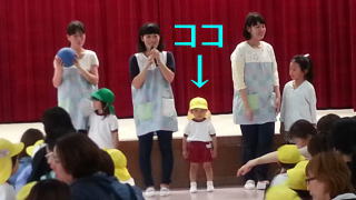 たまたま最前列にいた緑之助、遊戯の説明のため皆の前に立たされました。