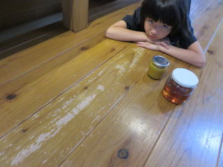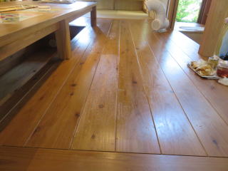 | 床の塗装が剥がれています。我が家で傷みの激しい箇所の1つです。 建築士さんから分けて頂いた自然塗料を使ってみたいと思います。