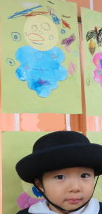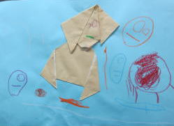 地味な色の折り紙で犬の形を折り、周りに家族を描いてみました。実は犬ではなくスフィンクス。エジプトを旅している将来の僕です。考古学者になって研究しつくされた遺跡から新たな発見をしてみたいと思っています。作品No.3 みのむし