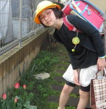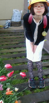 「咲け咲け~ポンッ」 と魔法をかけたら、依亜ちゃんの登校時には咲いていなかったチューリップが、あら不思議、咲いちゃいました!
