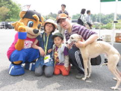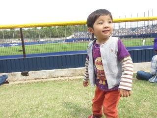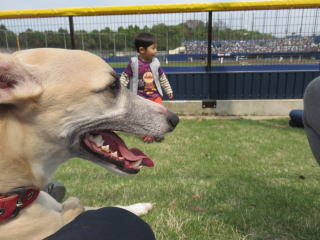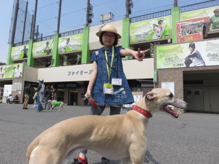 ここで、緑之助の恐るべき行動力を目の当たりに!! 外野席で観戦中の犬連れの方達、一人ひとりに挨拶回り、「ワンちゃん何歳ですか?」2015年4月26日 何の日か知ってる?
