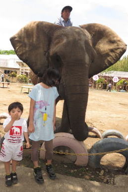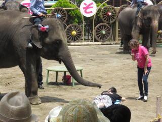 象の「ゆめかちゃん」にマッサージをしてもらう。なんてコーナーもあり、寝転がってトントンとされているおじさんが・・・あれ?おとうさんじゃないの!!