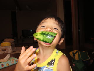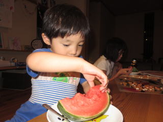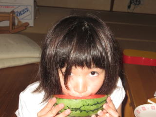 お父さんが会社帰りにスイカを買ってきてくれました。小玉スイカだから、ちょうどよい大きさ、とっても甘かったです。