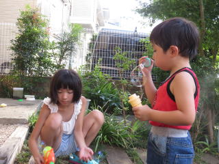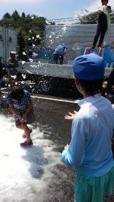 シャボン玉に 水掛け遊び