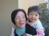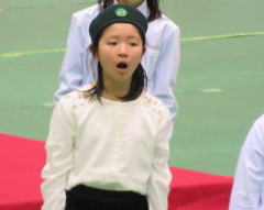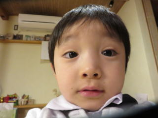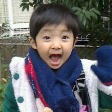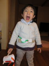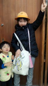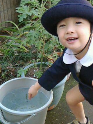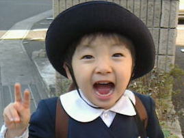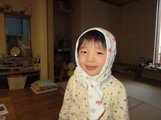 頭から手ぬぐい被って、似合ってるね。っていうのも可笑しいけど、お遊戯会で他の人がやっている「おじいさん」の真似かな?