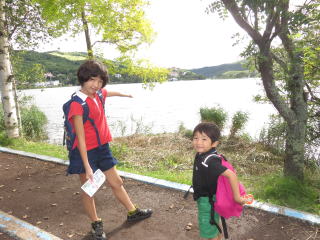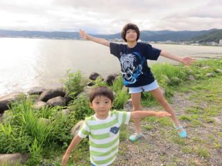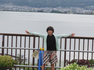 名残惜しい 楽しい旅が終わります 諏訪湖をバックに記念撮影 さようならー