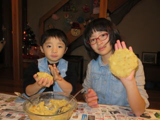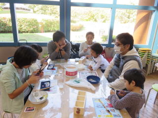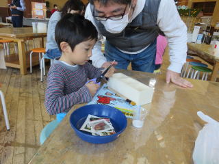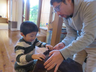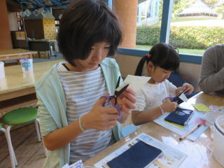 紙片をペタペタと 貼っていきます 従姉弟たちも一緒です