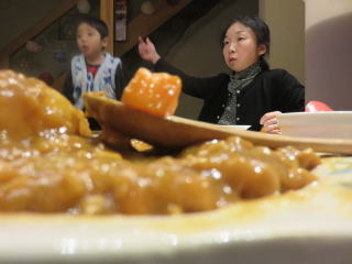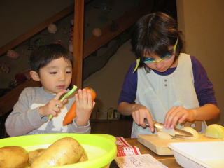 カレー作りは 私たちのお仕事 皮むき 包丁 手慣れたものだ