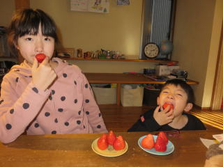 はー 疲れた お家に帰って イチゴでビタミン補給じゃ