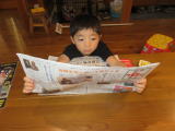 新聞をじっくり読んでいますが、子供新聞の漫画です(笑)
