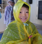外ではお祭りのようにイベントが開催されていて、降雨体験車ではカッパを着て台風を体験