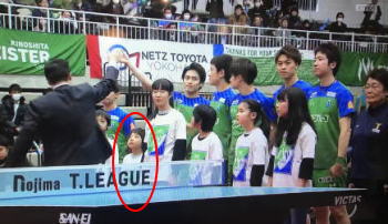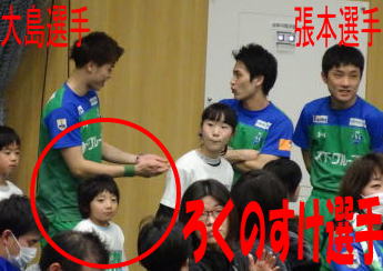 日本代表の張本選手や水谷選手が間近にいますが、緑之助が手をつなぐのは大島選手。