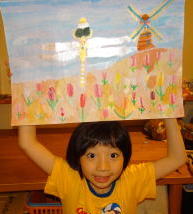 緑之助画伯は チューリップ畑の風車と、優雅に飛ぶトンボを書きました