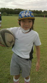 日曜日のラグビースクールはタックル有りなので、ヘッドキャップを被ります。
