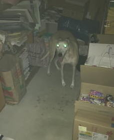 (雷が鳴り 暗い納戸に逃げ込み 身をひそめる サン君)
