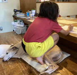 サン君 そこに寝ていたら ボクが座って宿題できないよ