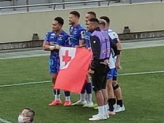 試合終了後 トンガ選手が国旗を掲げます 会場内外でトンガの支援の輪が広がります