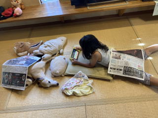 サン君の真似して エアコンでお腹が冷えないように新聞紙は掛けています(爆笑)