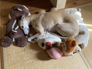 みんなお出かけしている時は お友達(ぬいぐるみ)と一緒に(踏みつぶして)寝ています