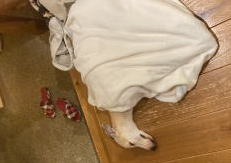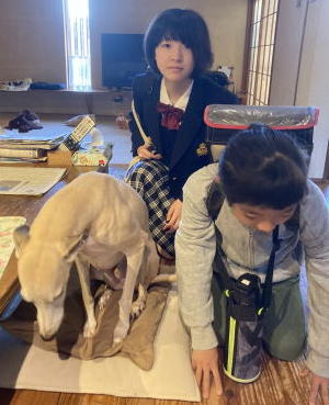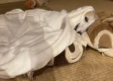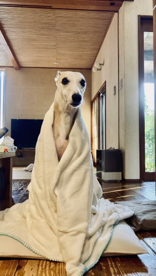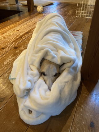 サン君は 寒いから 毛布にくるまって 緑之助の帰りを待っています