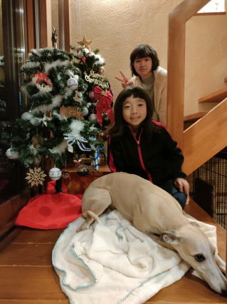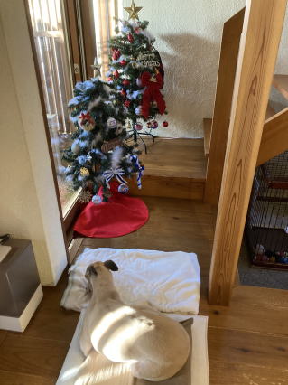 飾りを分け合ってクリスマスツリーの完成です。サン君もお部屋がにぎやかになって嬉しいようです。
