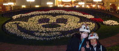 花壇のミッキーマウスもサンタ差の帽子をかぶって笑いかけているね