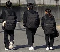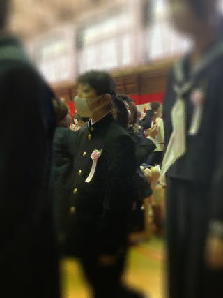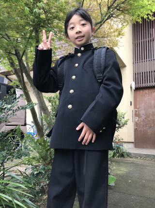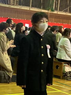 マスク、緊張、ブカブカ制服、髪留めで入場