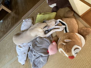 好きなぬいぐるみや 毛布を 器用に敷きならべ お昼寝ベッドを作ります