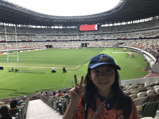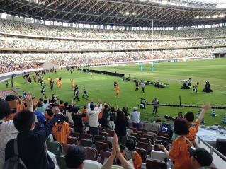 バックスタンドの端っこの席ですが、トライの攻防が間近で見られるのです。